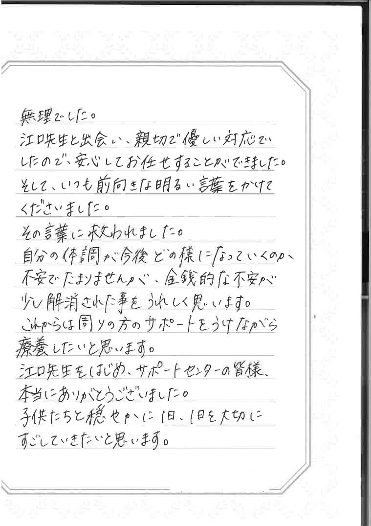 江口先生をはじめ、サポートセンターの皆様、本当にありがとうございました。子供たちと穏やかに1日1日を大切にすごしていきたいと思います。